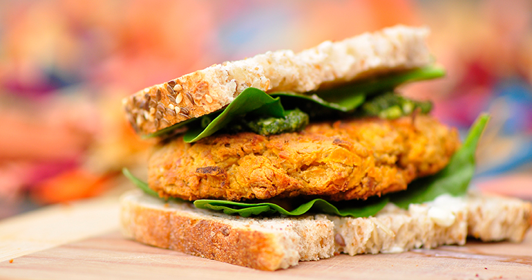 Formar hamburguesas y empanarlas con rebozado de arroz.
